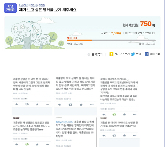 지난 9일 '영화 보고 싶어요'라는 아이디의 한 네티즌은 포탈 사이트 다음의 아고라(http://bbs3.agora.media.daum.net/gaia/do/petition/read?bbsId=P001&articleId=161760#commentFrame) 를 통해 "제가 보고 싶은 영화를 보게 해주세요!"라는 제목의 청원을 올렸다. 좋은 영화임에도 불구하고 대기업과 직배사들의 영화에 밀려 좋은 작품을 볼 수 있는 권리를 박탈당하고 있으니 가족들과 원하는 시간대에 볼 수 있도록 상영관을 늘려달라는 내용의 서명 운동은 오픈 후 많은 화제를 모으며 서명 동참과 응원 댓글이 줄을 잇고 있다.