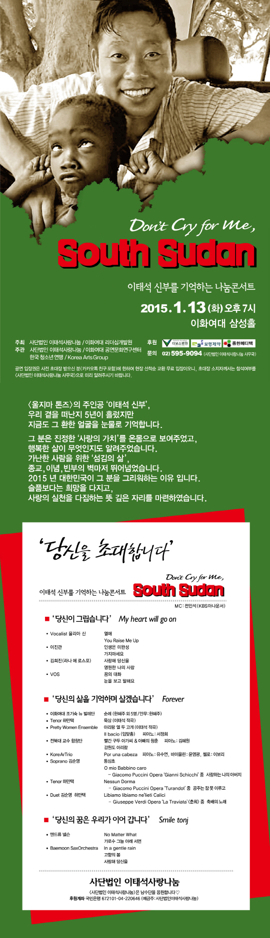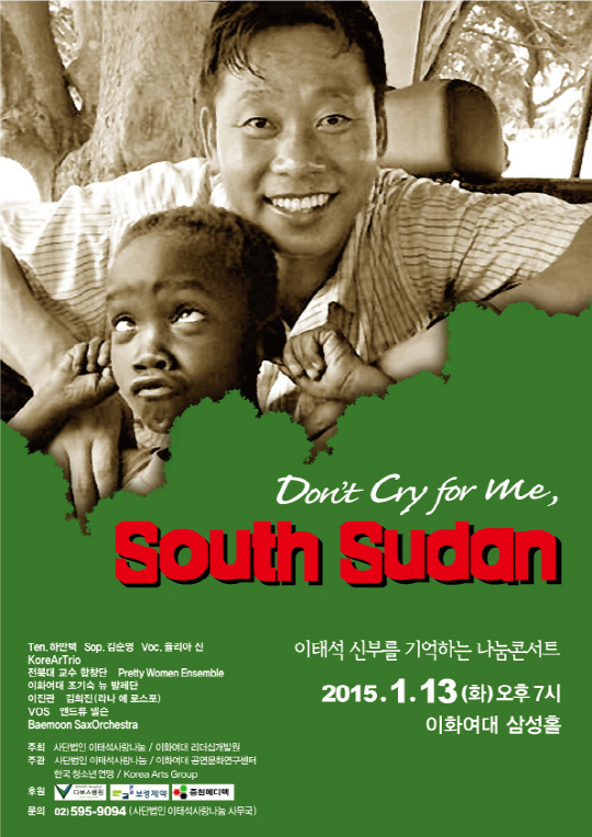 '울지마 톤즈'의 주인공 이태석 신부의 거룩한 삶을 기리는 나눔 콘서트가 열린다. 오는 13일 저녁 7시 서울 이화여대 삼성홀에서 열리는 'Don't cry for me South Sudan' 콘서트.