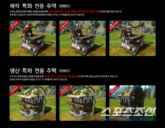 기존 중, 대형 주택을 건축물 변경을 통해 장비, 소비품, 특산품 등 제작 특화 전용 주택으로 새롭게 꾸밀 수 있다. 생산 특화 전용 주택은 기존 초가지붕 농장을 변경해 농사, 축산, 채광에 특화한 형태로 만드는 것이 가능하다.