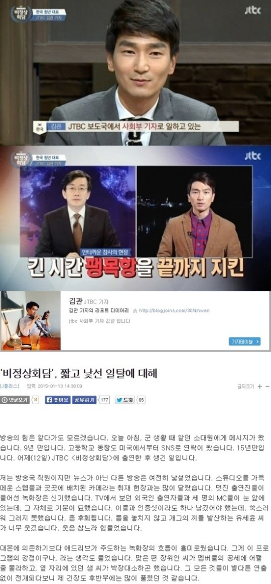 김관 기자는 "방송의 힘은 알다가도 모르겠습니다"라며 "오늘 아침, 군 생활 때 알던 소대원에게 메시지가 왔습니다. 9년 만입니다. 고등학교 동창도 미국에서부터 SNS로 연락이 왔습니다. 15년 만입니다. 어제(12일) JTBC '비정상회담'에 출연한 후 생긴 일입니다"라고 말문을 열었다.