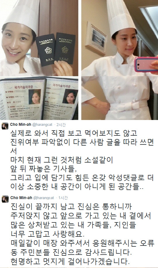 조민아는 14일 자신의 트위터에 "실제로 와서 직접 보고 먹어보지도 않고 진위여부 파악 없이 다른 사람 글을 따라 쓰면서 마치 현재 그런 것처럼 소설같이 앞 뒤 짜놓은 기사들, 그리고 입에 담기도 힘든 온갖 악성댓글로 더 이상 소중한 내 공간이 아니게 된 공간들"이라며 베이커리 가격 논란 후 심경을 밝혔다.
