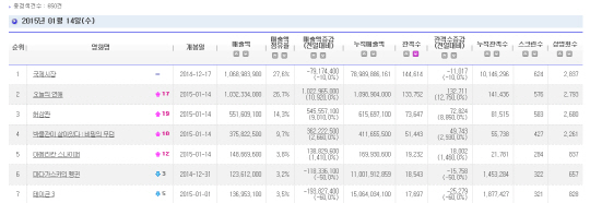 15일 오전에 집계된 영화진흥위원회 입장권통합전산망에 따르면 지난 14일 개봉한 이승기 문채원 주연의 영화 '오늘의 연애'(감독 박진표)는 첫날 13만 3752명의 관객을 동원하며 박스오피스 2위에 올랐다. 1위인 천만영화 '국제시장'의 기록(14만4614명)과도 큰 차이가 없는 기록. 같은 날 개봉한 하정우 하지원 주연의 '허삼관'(감독 하정우)은 7만3647명의 관객으로 3위를 차지했다.