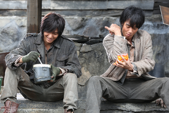 '말죽거리 잔혹사'와 '비열한 거리'를 잇는 유하 감독의 거리 3부작 완결편인 '강남 1970'이 성공을 향해 거칠게 내달렸던 종대(이민호)와 용기(김래원)의 넝마주이 시절의 스틸을 최초 공개했다. 1970년대 욕망의 땅 강남으로 올라오기 전 넝마주이 혹은 재건대로 불렸던 두 남자를 그대로 스크린으로 옮긴 '강남 1970'. 공개된 스틸 속 종대와 용기는 허름한 옷을 입은 채 철통에 담긴 죽을 떠먹고, 겨우 모은 돈으로 산 라면 한 개를 사이 좋게 나눠먹는 힘들고 배고픈 시절임에도 얼굴에는 장난기 가득한 웃음 띠고 있어 넝마주이 시절의 두 남자의 호흡에 대한 호기심을 자극한다. 고아원에서 만나 서로를 형제이자, 친구이자 가족으로 여기는 두 사람의 형제애가 단연 돋보이는 순간이기도 하다.