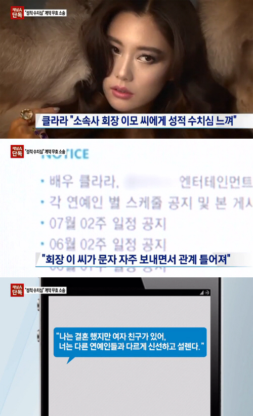 채널A는 지난 14일 "클라라가 소속 회장 이 모 씨에게 성적 수치심을 느껴 지난 9월 계약 해지를 통보, 지난달 말 소속사를 상대로 전속 계약 무효 소송을 제기했다"고 보도했다.
