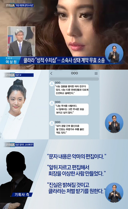 클라라가 눈물로 용서를 구했다는 것은 지난해 10월 회장님에게 사과하면 계약해지를 시켜준다는 말을 믿고 일광폴라리스 법무실 변호사가 시키는 대로 사과를 했을 뿐이며, 계약해지를 하게 된 성적 수치심 발언 등의 내용은 사실이었다는 것.