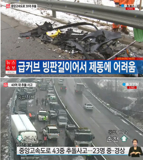 16일 오전 10시 15분쯤 강원 횡성군 공근면 공근리 중앙고속도로 부산방면 345㎞ 지점에서 승용차 등이 눈길에 미끄러지면서 43중 추돌사고가 발생했다.