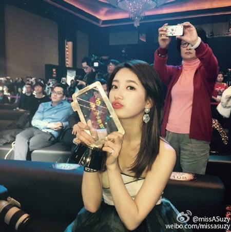 수지는 이날 시상식에서 '올해의 여신'으로 꼽혀 트로피를 받았다. '올해의 여신'은 2014년 웨이보를 달군 여자 스타에게 수여하는 상이다.