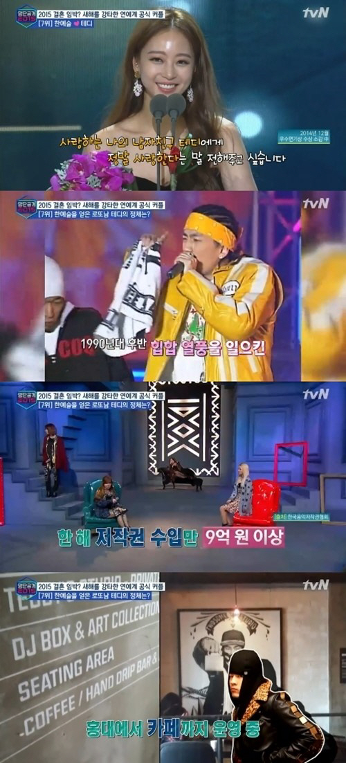 지난 5일 방송된 tvN '명단공개 2015'에서 한예슬과 테디 커플이 '2015 결혼 임박? 새해를 강타한 연예계 공식 커플' 7위로 선정됐다.