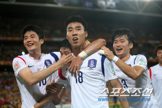 ◇이정협(가운데)이 17일(한국시각) 브리즈번스타디움에서 펼쳐진 호주와의 2015년 호주아시안컵 조별리그 A조 최종전에서 전반 32분 선제골을 넣은 뒤 동료들과 기쁨을 나누고 있다. 사진제공=대한축구협회