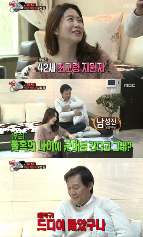 이날 남성진은 입대 준비를 하는 아내 김지영의 모습을 보며 "무슨 불혹의 나이에 입대를 하려고 하느냐"라고 말했다.