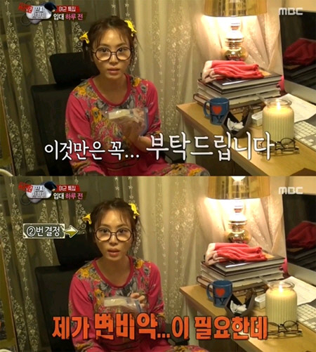 강예원은 입소 전날 민낯에 왕눈이 안경을 쓴 편안한 모습으로 짐을 챙겼다. 강예원은 제작진에 "변비약은 꼭 필요한데 갖고 가도 되냐. 튼튼한 장을 위해 꼭 부탁드린다"고 말했다.