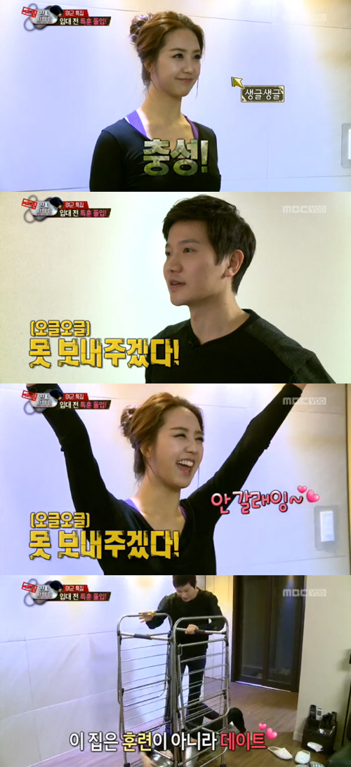 또한 이지애와 김정근 아나운서는 빨래 건조대와 청소기를 들고 유격훈련 연습을 하면서도 데이트를 하듯 화기애애한 분위기를 연출해 웃음을 선사했다.
