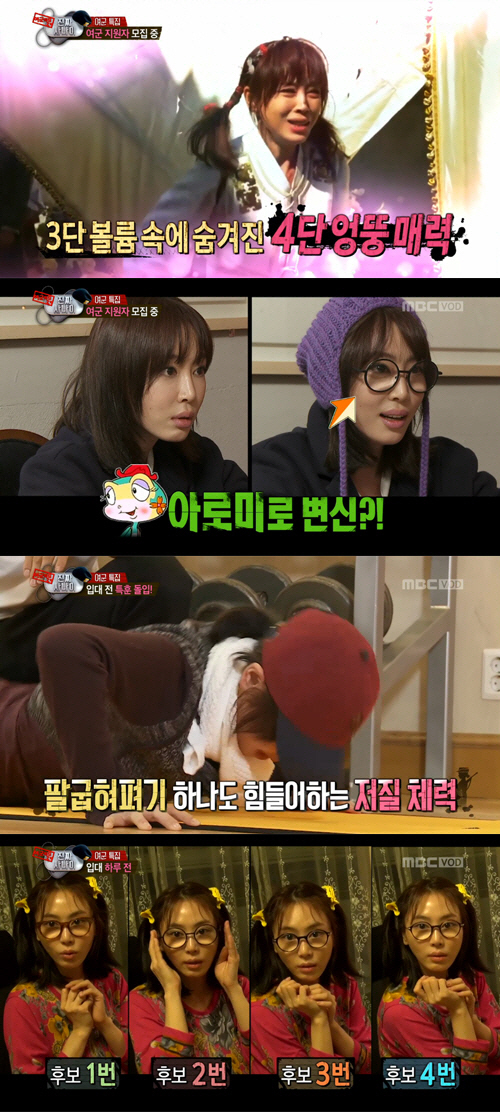 또 '진짜사나이'의 훈련에 앞서 개인 트레이닝을 받은 강예원은 팔굽혀펴기와 윗몸 일으키기를 하나도 성공하지 못해 저질 체력을 인증했다.