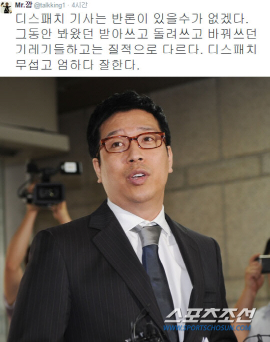 강병규는 19일 자신의 트위터를 통해 "'디스패치' 기사는 반론이 있을 수가 없겠다"며 "그동안 봐왔던 받아쓰고 돌려쓰고 바꿔 쓰던 기레기들하고는 질적으로 다르다. '디스패치' 무섭고 엄하다 잘한다"라는 글을 올렸다.