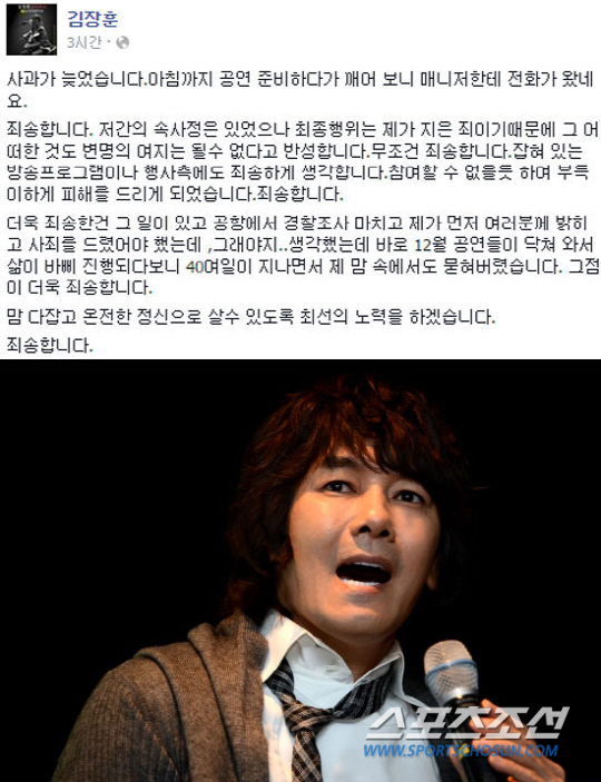 김장훈은 "죄송하다. 저간의 속사정은 있었으나 최종행위는 제가 지은 죄이기 때문에 그 어떠한 것도 변명의 여지는 될 수 없다고 반성한다. 무조건 죄송하다"며 "잡혀 있는 방송프로그램이나 행사측에도 죄송하게 생각한다. 참여할 수 없을 듯 하여 부득이하게 피해를 드리게 되었다. 죄송하다"고 고개를 숙였다.