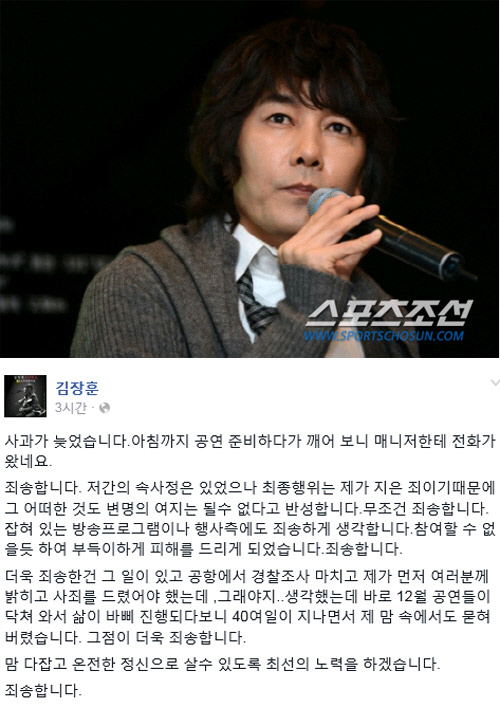 이어 그는 "죄송합니다. 저간의 속사정은 있었으나 최종행위는 제가 지은 죄이기 때문에 그 어떠한 것도 변명의 여지는 될 수 없다고 반성합니다. 무조건 죄송합니다"며 "잡혀 있는 방송프로그램이나 행사측에도 죄송하게 생각합니다. 참여할 수 없을듯하여 부득이하게 피해를 드리게 되었습니다. 죄송합니다"고 사과했다.