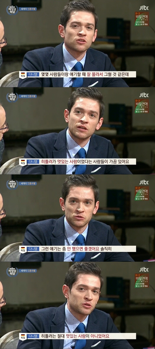 이어 "예전에 택시를 타고 가다가 기사 아저씨가 그런 이야기를 하더라"라며 "독일 사람으로서 택시에서 내리고 싶었다. 독일에서 그렇게 이야기하면 잡혀간다. 히틀러는 정말 악마였다"라고 강조해 눈길을 끌었다.