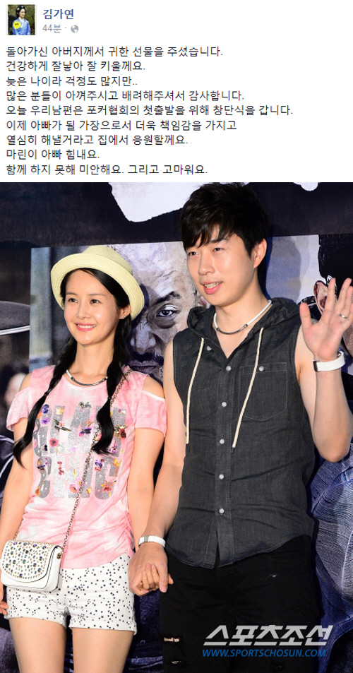 이날 김가연은 자신의 페이스북에 "돌아가신 아버지께서 귀한 선물을 주셨습니다. 건강하게 잘 낳아 잘 키울게요. 늦은 나이라 걱정도 많지만 많은 분들이 아껴주시고 배려해주셔서 감사합니다"라고 글을 올려 임신 소식을 알렸다.