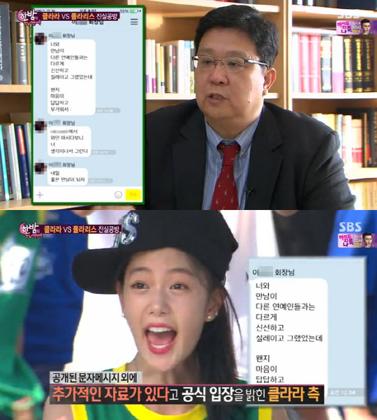 이날 방송에서 클라라 측은 폴라리스 회장으로부터 '신선하고 설렌다' 또 '와인 마시다 네 생각이 났다'는 문자 메시지를 공개했다. 이 문자 메시지는 클라라가 폴라리스 회장에게 성적 수치심을 받았다고 주장하는 부분이다.