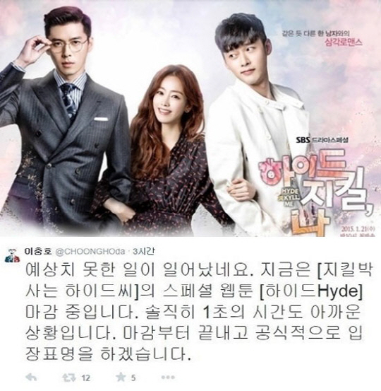 이충호 작가는 자신의 트위터에 "예상치 못한 일이 일어났네요. 지금은 '지킬박사는 하이드씨'의 스페셜 웹툰 '하이드Hyde' 마감 중입니다. 솔직히 1초의 시간도 아까운 상황입니다. 마감부터 끝내고 공식적으로 입장표명을 하겠습니다"라고 글을 게재했다.