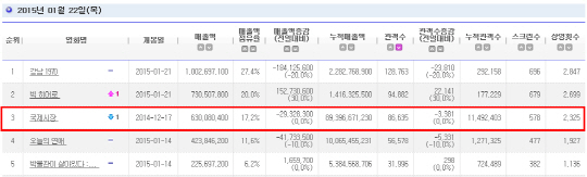 역대 휴먼 드라마 사상 최고의 오프닝 스코어(18만4972명), 역대 1월 1일 최다 관객수(75만1253명) 등을 기록하며 새해 첫 1000만 영화에 등극한 '국제시장'이 누적관객수 1149만2403 명을 동원했다. 이는 '해운대'가 세운 1145만3338명을 넘어선 기록으로, 윤제균 감독은 이로써 자체 최고 스코어를 경신하게 됐다.