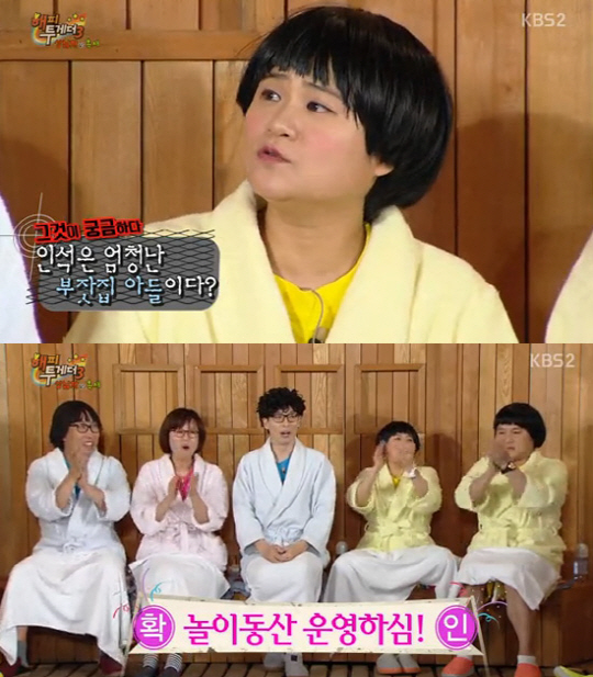 이날 김인석은 "부잣집 아들이라는 소문이 있다. 아버지가 놀이동산 운영하신다고 하더라"는 말에 "그 얘기 때문에 아버지께 엄청 혼났다"고 말했다. 그러자 박명수는 "맞아요? 아니에요? 그것만 이야기 하세요 일단"이라고 재촉했고, 이에 김인석은 "놀이동산을 하셨었다"고 말하자 출연진들은 박수를 치며 깜짝 놀란 반응을 보였다.