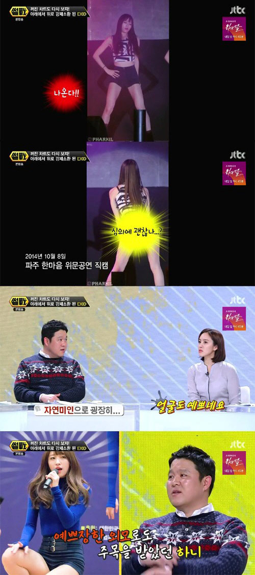 지난 22일 방송된 JTBC '썰전-예능 심판자'에서 김구라, 박지윤, 이윤석, 강용석, 허지웅은 최근 '위 아래'라는 곡으로 인기를 끌고 있는 걸그룹 EXID(솔지, LE, 정화, 하니, 혜린)에 대한 이야기를 나눴다.