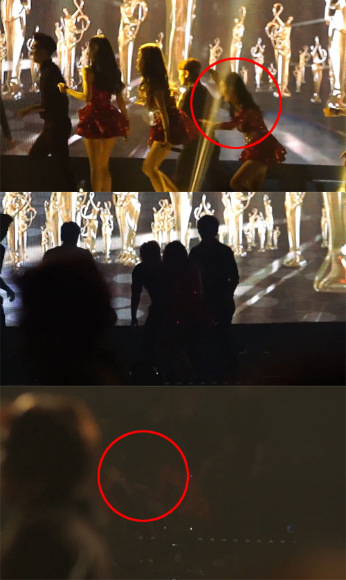 그러나 이 과정에서 서현이 돌아선 순간 한 차례 휘청거렸고, 이어 태연이 무대 아래로 내려가던 중 추락사고를 당했다 .놀란 멤버들과 댄서들은 추락한 태연의 상태를 살피고 사태를 수습했다. 당시 상황은 팬들이 직접 촬영한 동영상에 그대로 포착됐다.