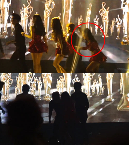 무대를 마친 태티서는 인사를 하며 퇴장을 준비했다. 그런데 이 과정에서 서현이 한 차례 휘청거리고, 이후 태연이 2m 높이의 무대 아래로 추락했다. 무대에 설치됐던 리프트가 갑자기 내려가면서 태연이 그 아래로 떨어지게 된 것.