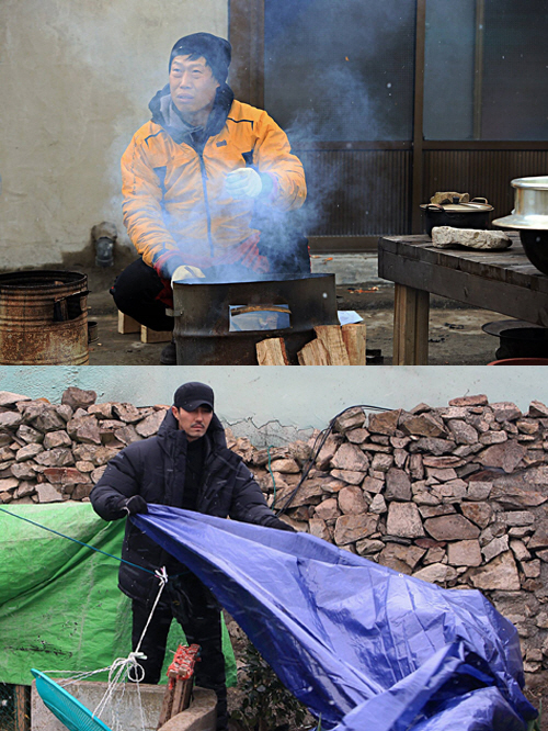 사진에는 열심히 불을 때고 있는 유해진이 연기가 눈이 매운 듯 찌푸리고 있는 모습과 무념무상의 표정으로 천막을 펼치고 있는 차승원의 모습이 담겨 있다.