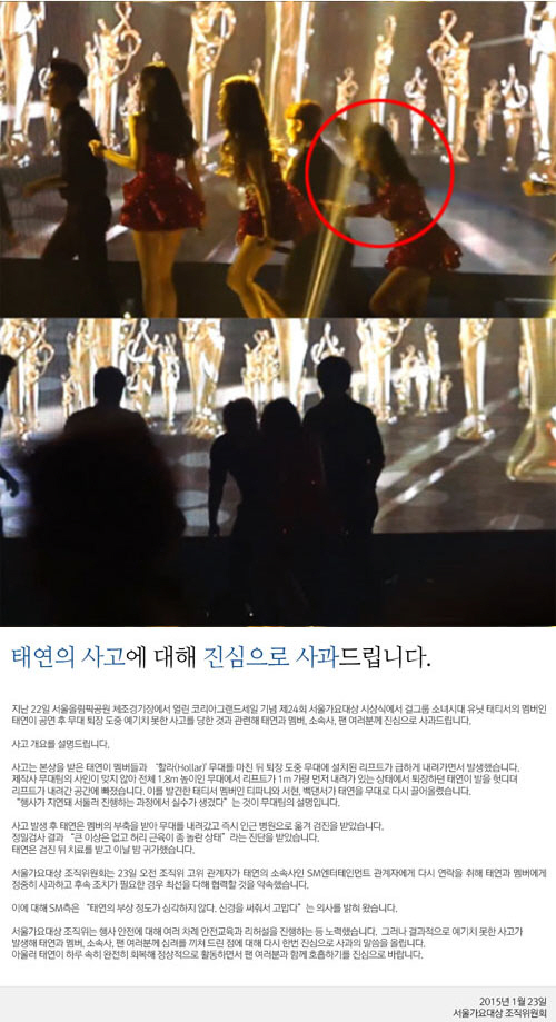 태연 추락사고에 서울가요대상 측이 홈페이지를 통해 공식 사과했다.