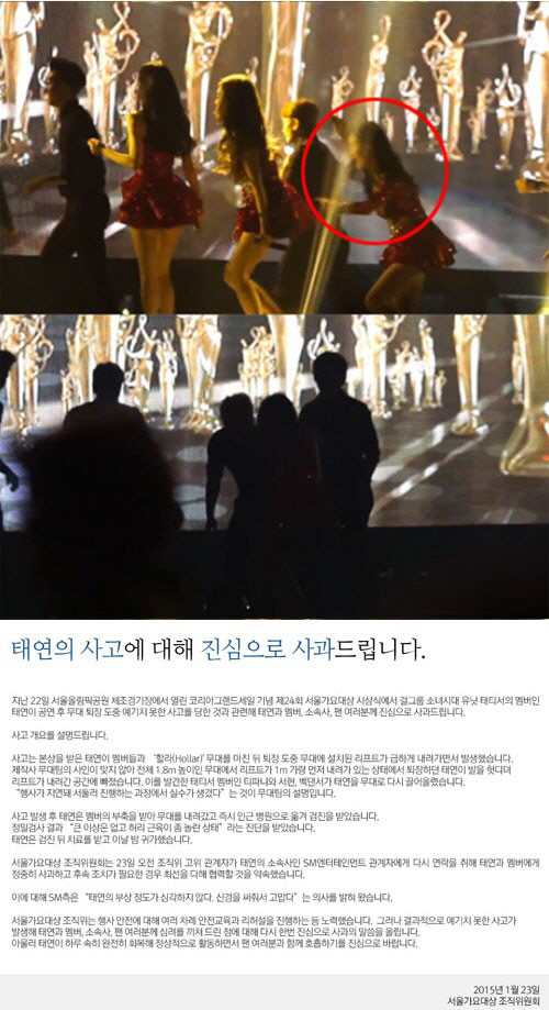 서가대 측은 "지난 22일 서울올림픽공원 체조경기장에서 열린 코리아 그랜드세일 기념 제24회 서가대 시상식에서 걸그룹 소녀시내 유닛 태티서의 멤버인 태연이 공연 후 무대 퇴장 도중 예기치 못한 사고를 당한 것과 관련해 태연과 멤버, 소속사, 팬 여러분께 진심으로 사과드린다"라고 운을 뗐다.