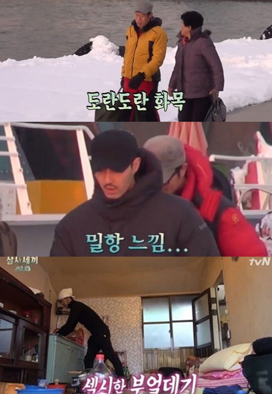 차승원과 유해진은 바람이 많이 부는 만재도인만큼 비닐로 지붕을 만들었다.