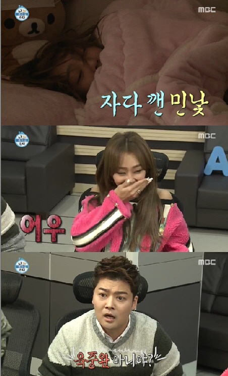 특히 첫 장면에서 이불 속 흐트러진 머리로 잠든 효린을 본 김광규와 전현무는 "뭐야 육중완인데?"라고 깜짝 놀란 뒤 놀려 효린을 민망하게 만들었다. <스포츠조선닷컴>