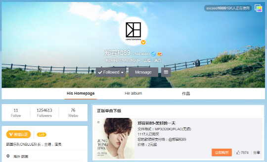 정용화가 중국 최대 SNS 사이트에서 한국 가수 최초로 음원 다운로드 서비스를 실시한다.