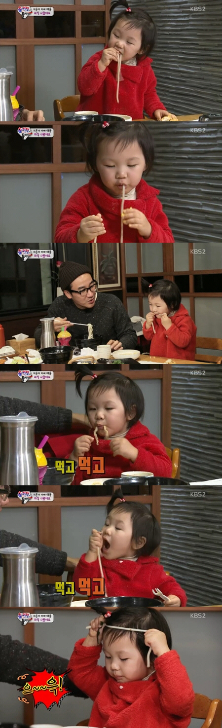 특히 면발을 쥐고 쉴 새 없이 먹어대는 지온의 모습에 엄태웅은 "너 올드보이 같아"고 말하며 환한 딸 바보의 미소를 지어보였다. <스포츠조선닷컴>