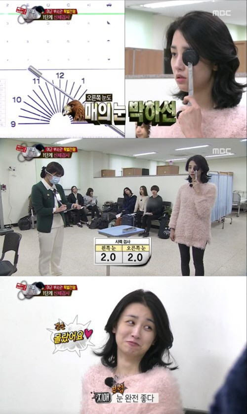 이날 본격적인 입대에 앞서 멤버들은 체력검사를 받았다. 시력 0.6으로 부적합 판정을 받은 엠버와는 달리 박하선은 왼쪽 오른쪽 시력 모두 2.0으로 깜짝 놀라게 했다.
