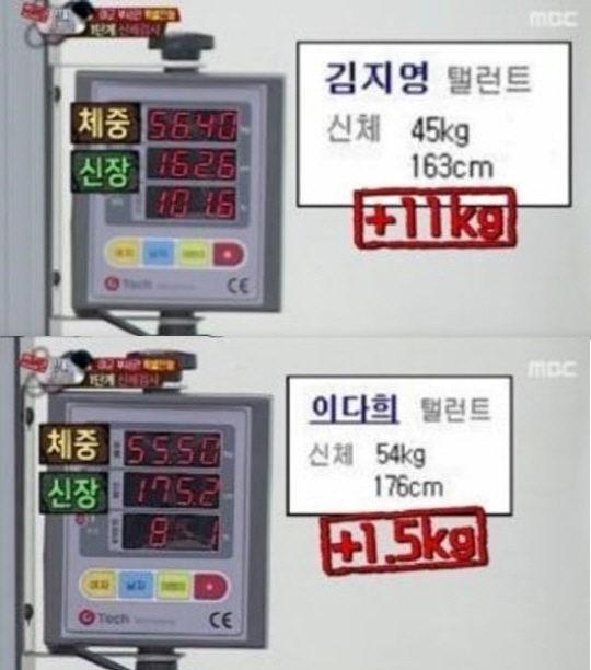 특히 여배우 김지영은 키 162cm에 몸무게 56kg으로 밝혀져 프로필상 몸무게와 11kg 차이로 가장 컸으며, 다희는 176cm에 55kg로 차이가 가장 적었다.