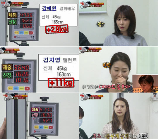 제일 먼저 측정한 맏언니 김지영은 프로필(45kg 163cm)과 상당히 달랐다. 실제(56.4kg 162.6cm)는 11kg이 더 나가는 몸무게로 민망해 하며 웃음을 자아냈다.