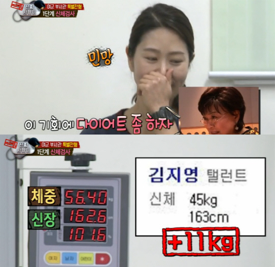 제일 먼저 측정한 맏언니 김지영은 프로필(45kg 163cm)과 상당히 달랐다. 실제(56.4kg 162.6cm)는 11kg이 더 나가는 몸무게가 나왔다. 내레이션을 맡은 김용림의 목에선 "이 기회에 다이어트 좀 하자"는 말이 나와 웃음을 자아냈다.
