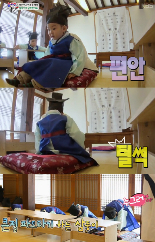 25일 방송된 KBS 2TV '해피선데이-슈퍼맨이 돌아왔다'에서는 배우 송일국과 삼둥이가 민속촌 서당 체험에 나선 모습이 전파를 탔다.