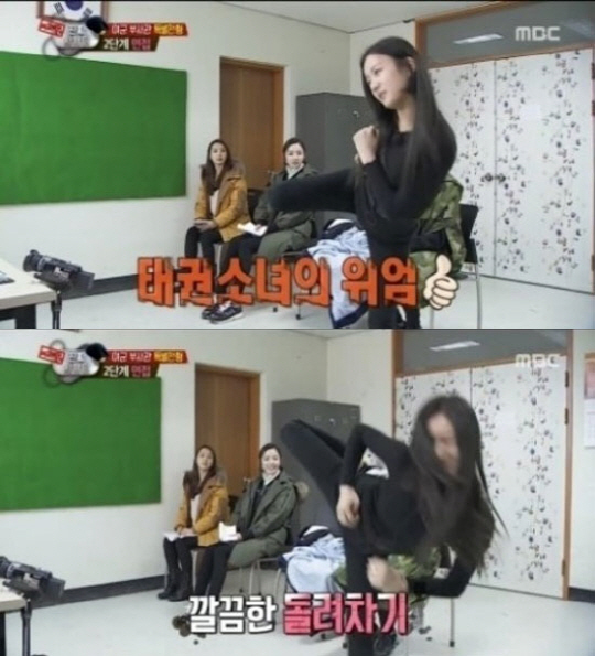 걸그룹 에이핑크 멤버 윤보미가 '태권도 소녀'로 부사관들의 극찬을 받아 눈길을 끌었다.