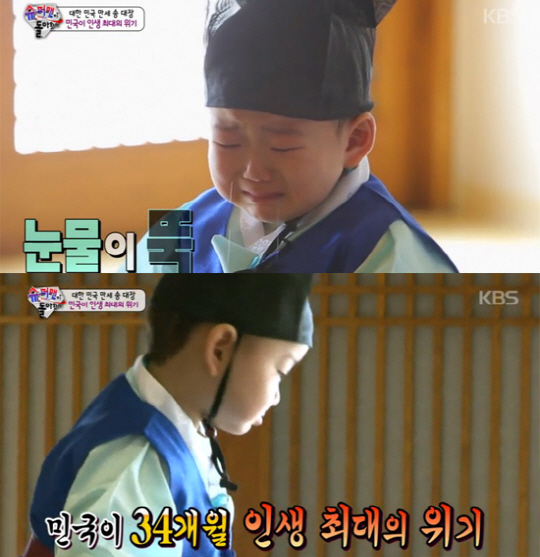 결국 훈장님은 민국이를 제지한 뒤 훈계를 했다. 민국은 앞으로 나가 입을 삐죽거리며 눈물을 흘렸다. 방송 자막에는 '민국이 34개월 인생 최대의 위기'라고 나와 재미를 더했다.