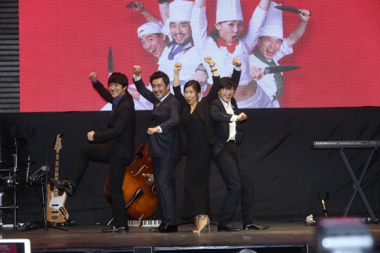 ◇'난타' 초연멤버인 장혁진 류승룡 서추자 김원해(왼쪽부터)가 지금도 쓰이고 있는 포스터 앞에서 똑같이 포즈를 취하고 있다. 사진제공=PMC프러덕션