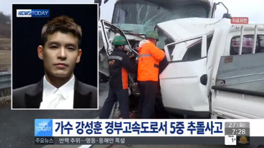 이 사고로 안씨의 승용차가 앞에 있던 정모씨의 승용차를 연쇄 추돌하는 등 5중 추돌사고가 발생했다. 강성훈 차량은 반파됐으나 사고가 경미해 강성훈을 포함해 운전자 3명은 경상을 입은 것으로 파악됐다.