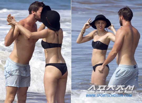 공개된 사진 속 마일리 사이러스는 한뼘 비키니 차림으로 패트릭 슈워제네거와 함께 해변에서 데이트를 즐기고 있는 모습. 특히 두 사람은 주변의 시선을 의식하지 않고, 키스를 하거나 포옹을 하는 등 진한 애정행각을 벌여 눈길을 끈다.