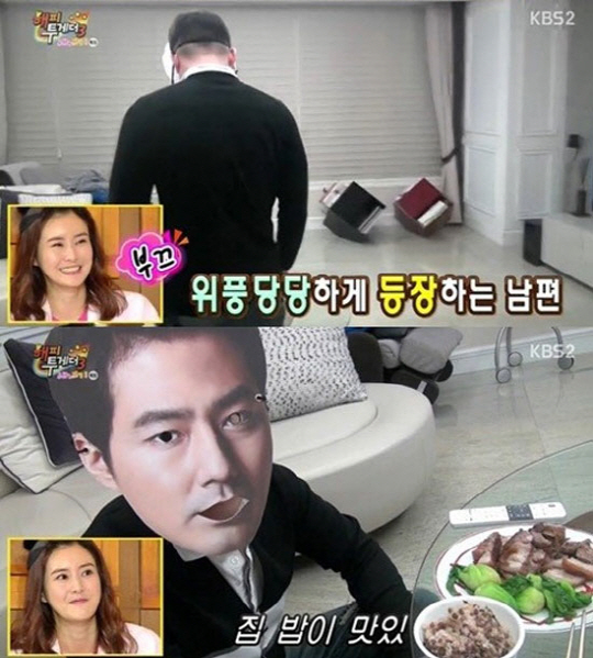 최정윤은 직접 밥상을 차리며 '주부 3년차'의 면모를 드러냈고, 이후 4살 연하의 훈남 남편이 조인성 가면을 쓰고 등장해 웃음을 자아냈다.