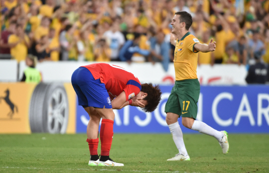 South Korea's Kim Young Gwon (L) looks dejected as Australia's Matt Mckay (R) celebrates winning the AFC Asian Cup football tournament after beating South Korea 2-1 at Stadium Australia in Sydney on January 31, 2015. AFP PHOTO / Peter PARKS -- IMAGE RESTRICTED TO EDITORIAL USE - STRICTLY NO COMMERCIAL USE