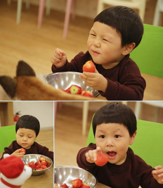 '애니멀즈'의 코너 '유치원에 간 강아지'에 출연 중인 4살 윤석이는 공개 된 사진 속 강아지 인형과 함께 다소곳이 앉아 딸기를 볼 가득 넣고 먹는데 집중하고 있다.