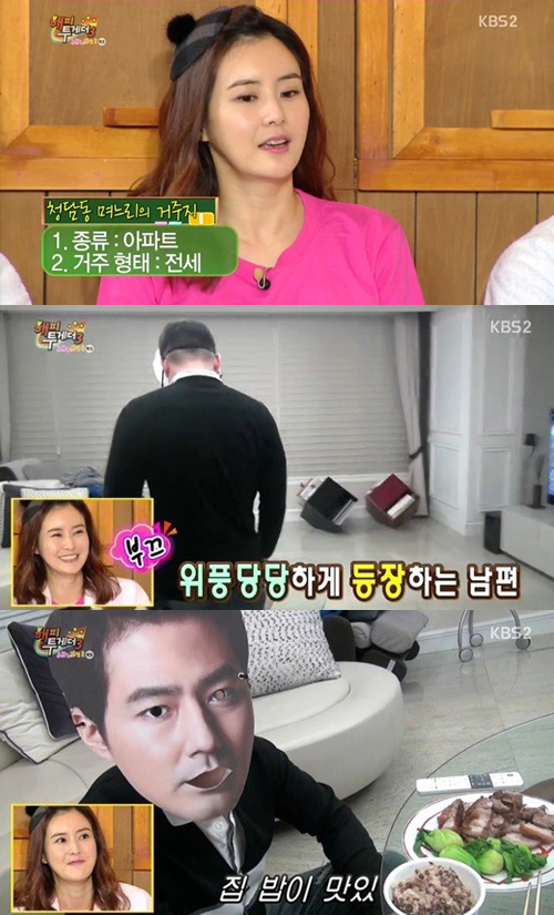 이날 최정윤은 최근 종영한 SBS 아침드라마 '청담동스캔들'의 극중 캐릭터와 마찬가지로 실제로 '청담동 며느리'가 아니냐는 MC들의 질문에 "맞다. 청담동 며느리다"라며 "나이에 비해 좋은 아파트에 살고 있다"라고 당당히 밝혔다. 이어 "전세 살고 있다. 남편이 무리해서 대출을 받았다"고 덧붙여 설명했다.